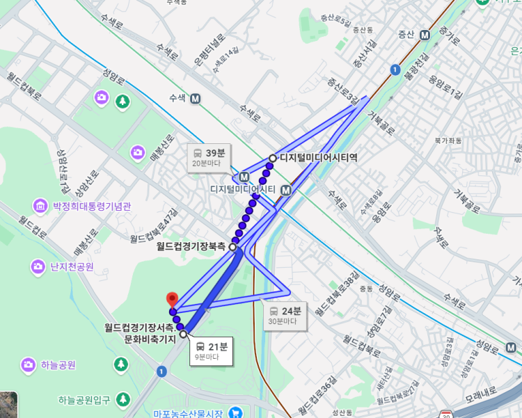상세 경로 보기: 디지털미디어시티역 -> 문화비축기지 대중교통 길 찾기
